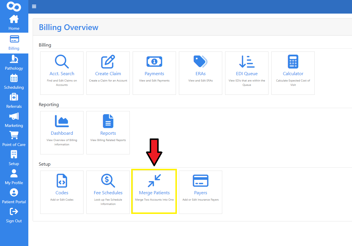 - Go to Setup > Billing > Merge Patients