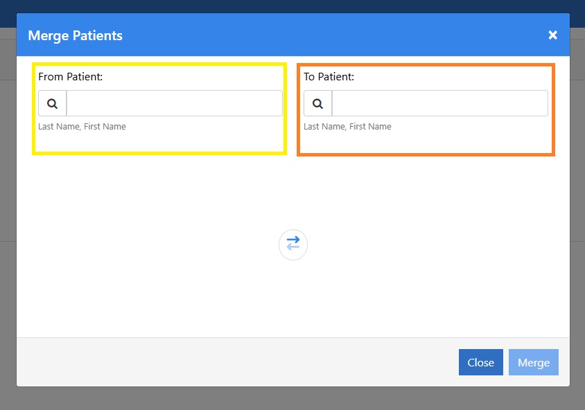 - In the pop-up window that opens, search for the two patient accounts that need to be merged. On the left side (From Patient), select the incorrect patient (the chart you want to discard). On the right side (To Patient), select the correct patient (the chart you want to retain). This ensures that the correct patient information is preserved during the merge process.